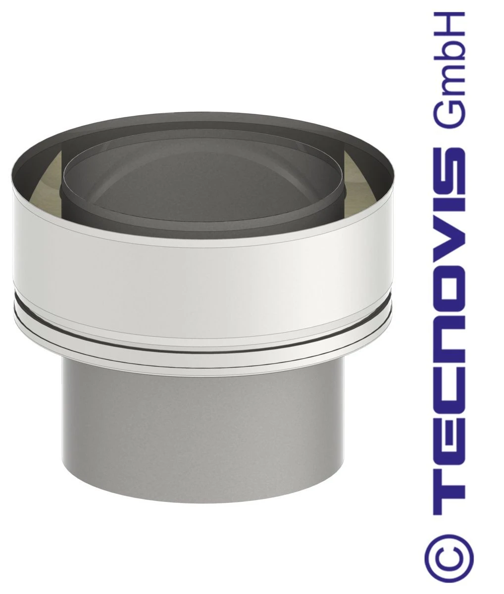 Verbindung zwischen Doppelwandig (oben) und Einwandig (unten). Das Übergangsstück besteht aus einem kurzem doppelwandigen Bereich sowie einem einwandigem Stutzen. Es wird bei kleistem Wandabstand und geringer Wandstärke oder dann eingesetzt, wenn der Ofen direkt neben oder hinter dem Schlot steht.
