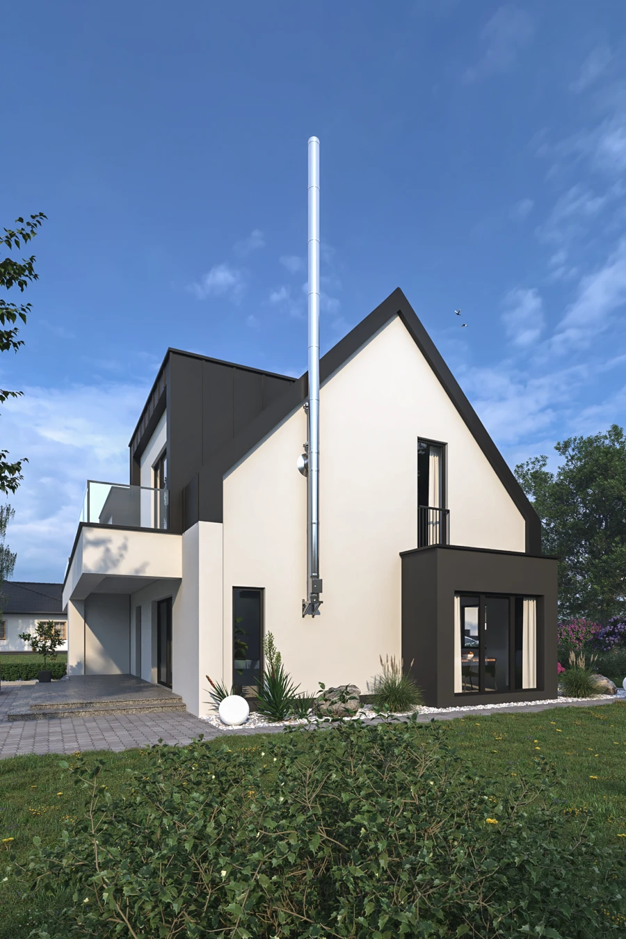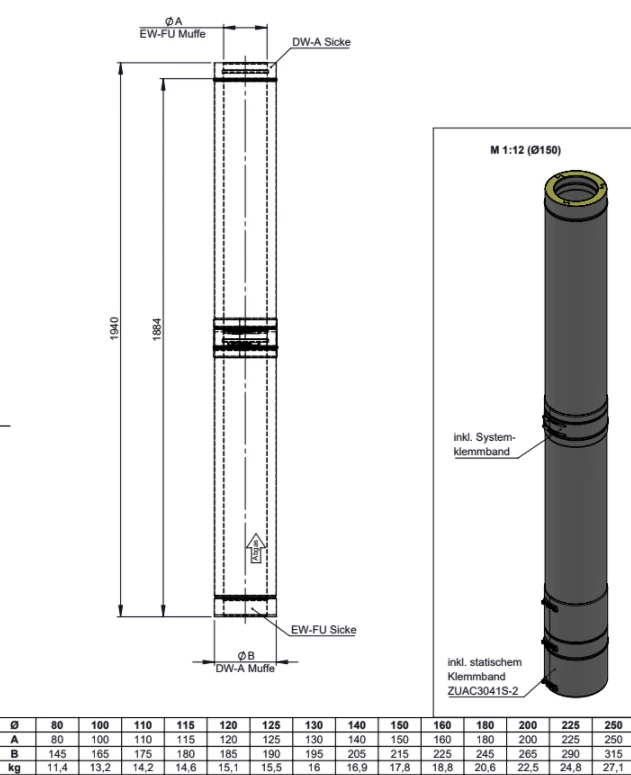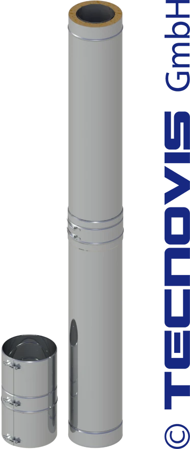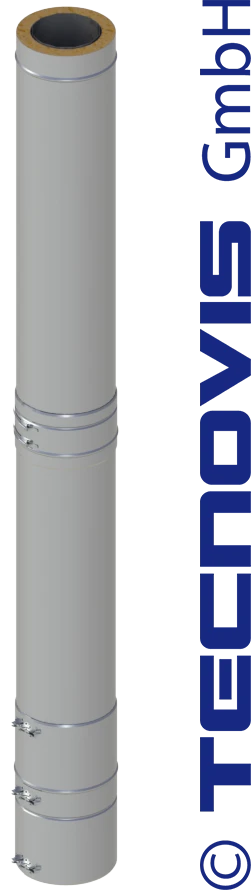 Dieses Längenelement is speziel entwickelt worden um die aufbau von ein 3 -5 m freikragender Schornstein möglich zu machen. Dazu brauchen Sie auch 40 cm hohe Klembänder (sehe Zeichnung).